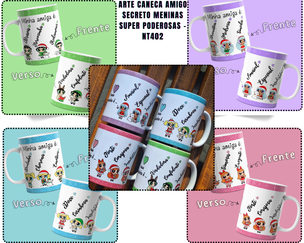 Surpreenda no Amigo Secreto com um presente cheio de atitude e nostalgia! Esta arte para Caneca combina o popular tema Meninas Super Poderosas com a celebração do Natal. É o mimo ideal para quem busca algo divertido, único e que remeta aos desenhos clássicos.